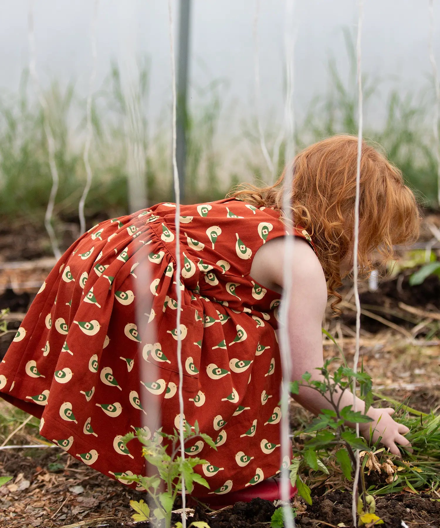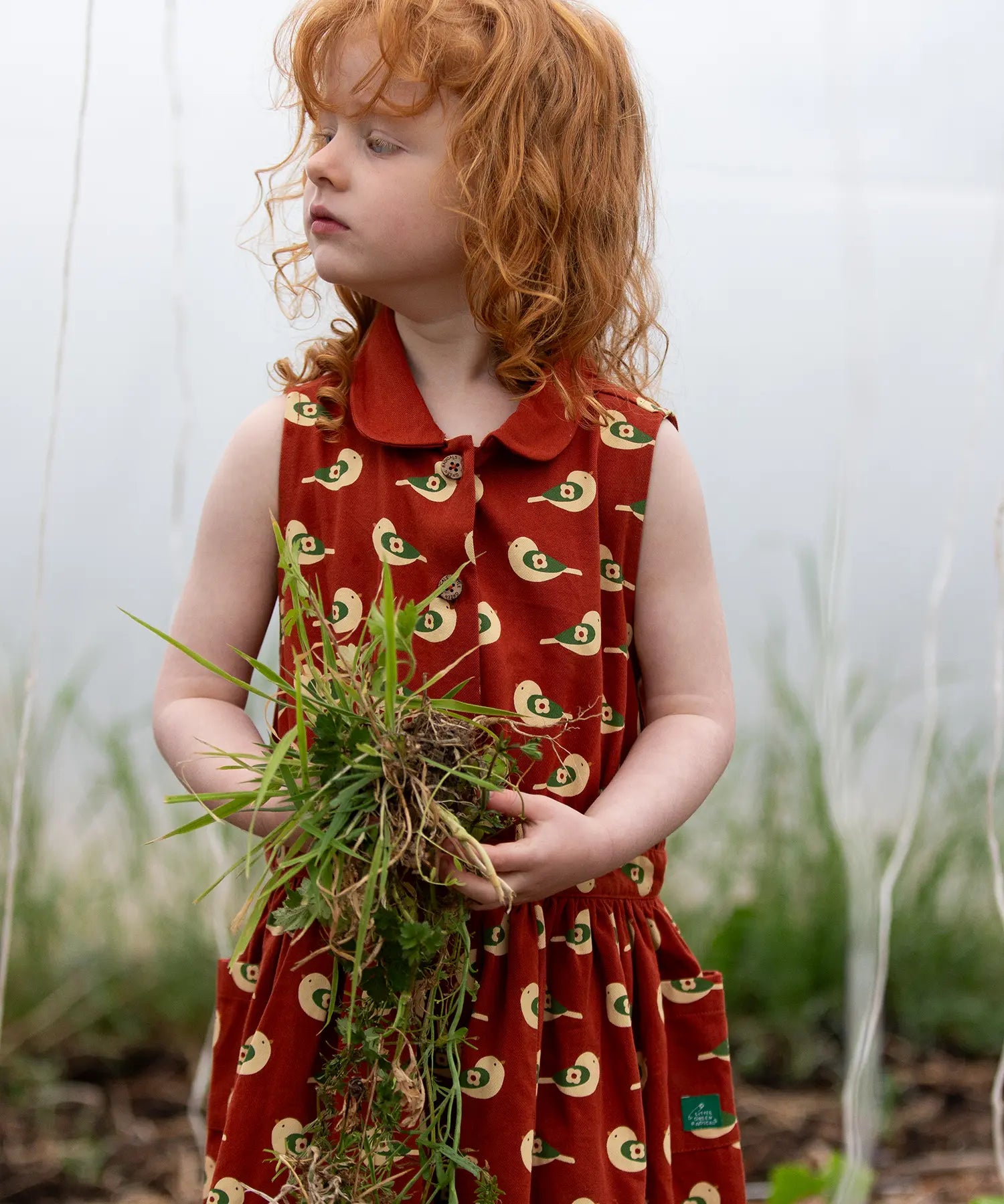 Child kneeling down wearing the Little Green Radicals child's red repeated spring birds print collared pinafore button dress.
