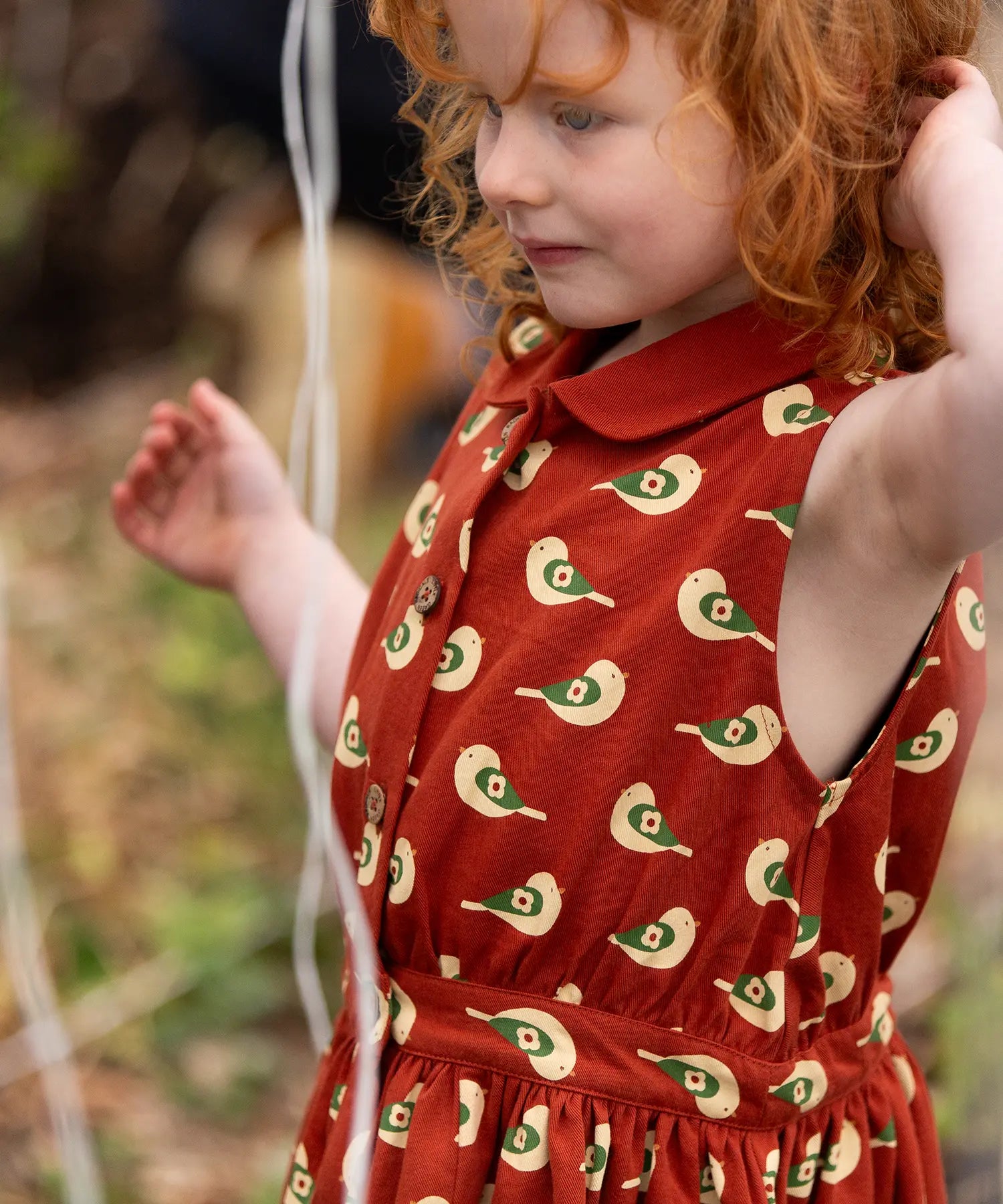 This Little Green Radicals Pinafore Dress is a knee-length children’s dress made from 100% organic and Fairtrade twill cotton. It comes in a deep rust red colour, printed with small cream garden birds all over, and paired with a soft Peter Pan collar that gives the piece a vintage-inspired yet timeless feel. Coconut buttons run from the collar to the waist, allowing for easy dressing while adding a natural, considered finish.