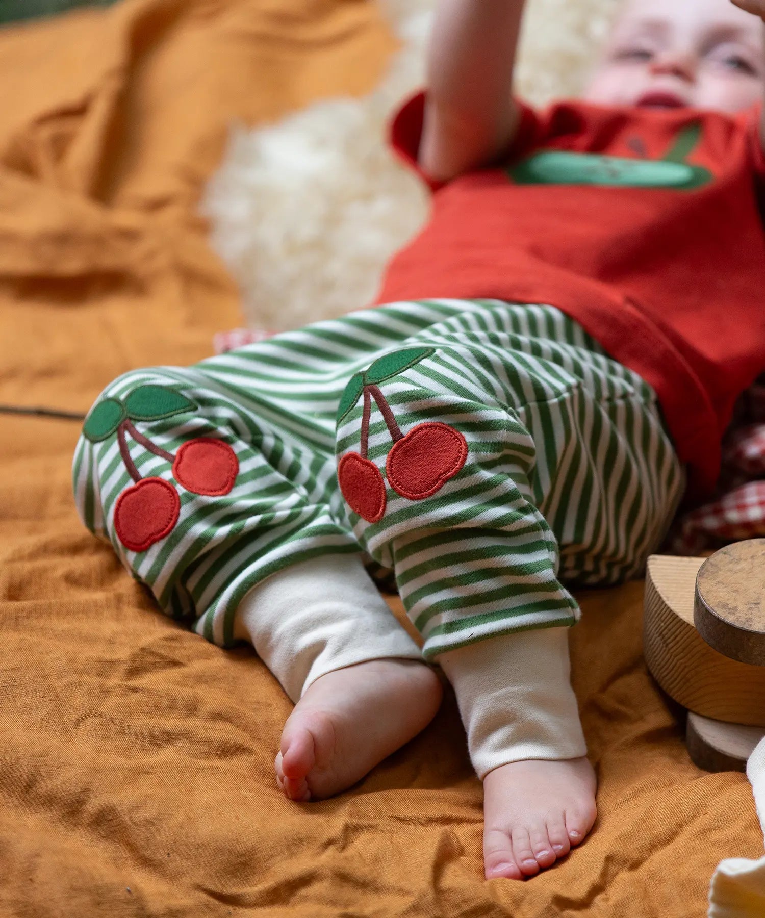 Close up of the red cherry knee appliques on the Little Green Radicals cherry knee patch green cream striped organic cotton joggers being worn.