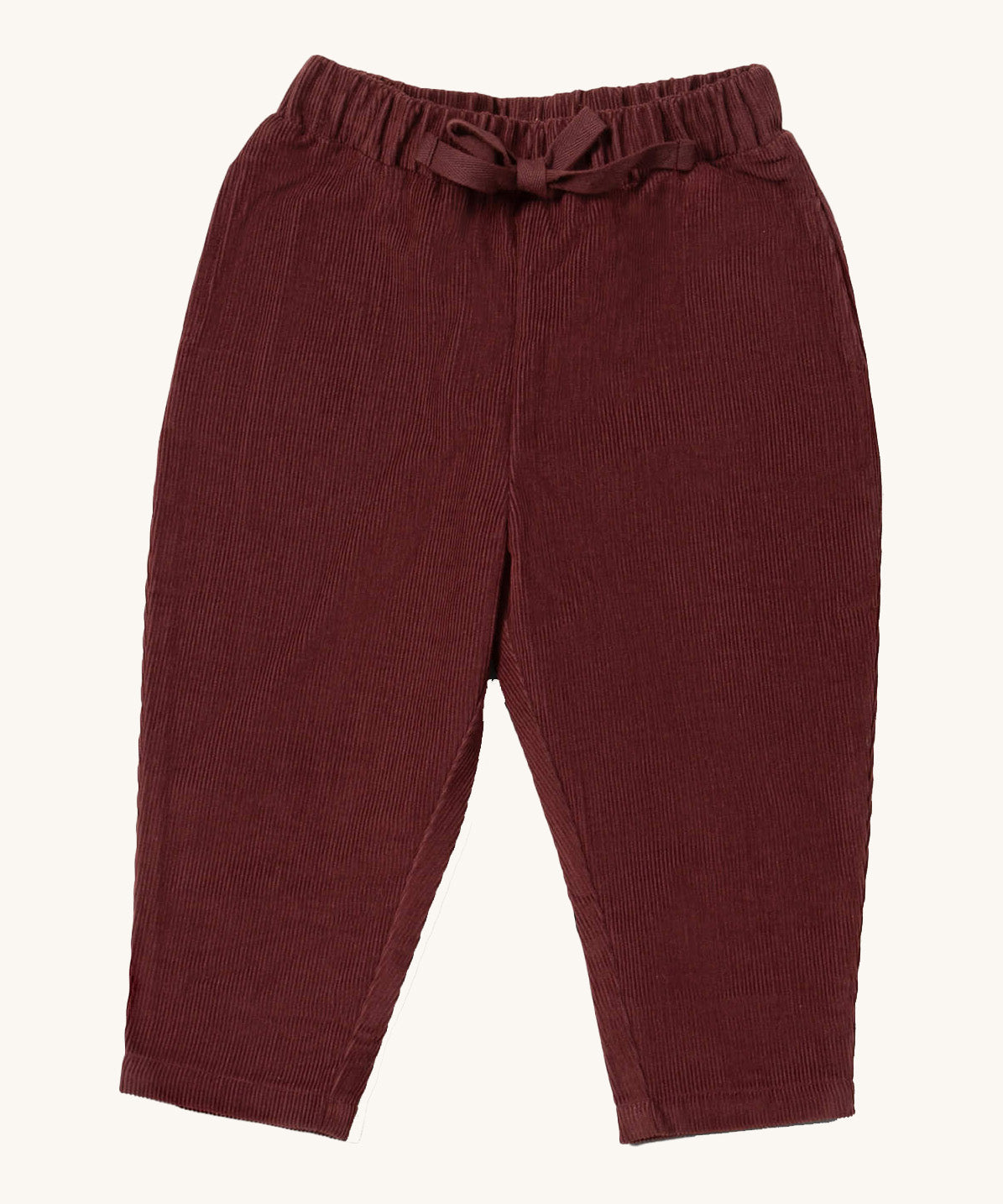 Little Green Radicals comfy trousers in chocolate corduroy available at Babipur.. A soft GOTS organic cotton trousers in dark maroon with elasticated waistband for a comfortable fit and a matching drawstring.