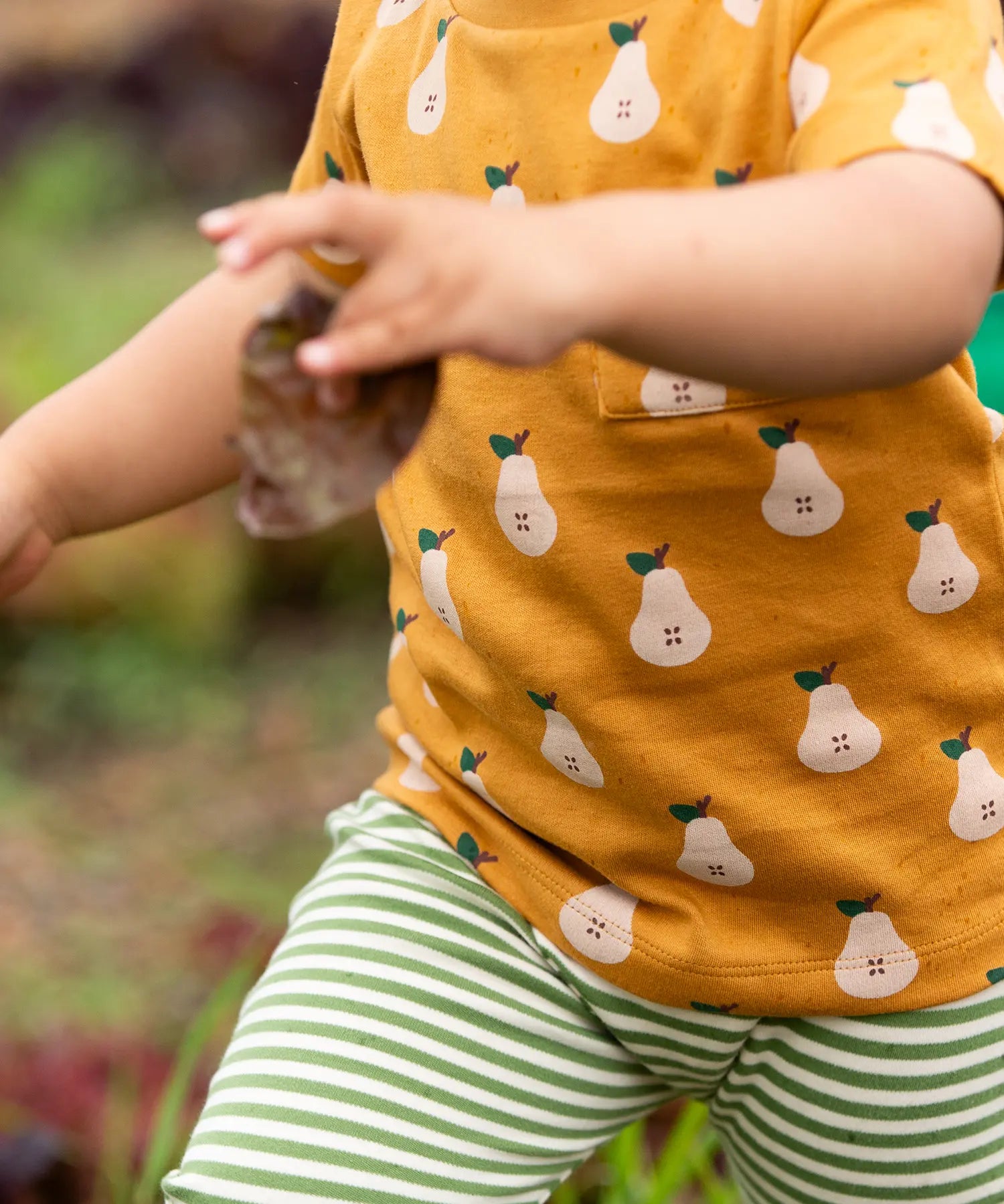 A two-piece baby and toddler outfit made from 100% organic and Fairtrade interlock cotton by Little Green Radicals. The playset includes a golden yellow short sleeve top printed with pear halves and finished with a small chest pocket, paired with cream and grassy green striped joggers. An envelope neckline makes dressing easier, while the elasticated waistband and cuffs on the bottoms provide a secure, comfortable fit.