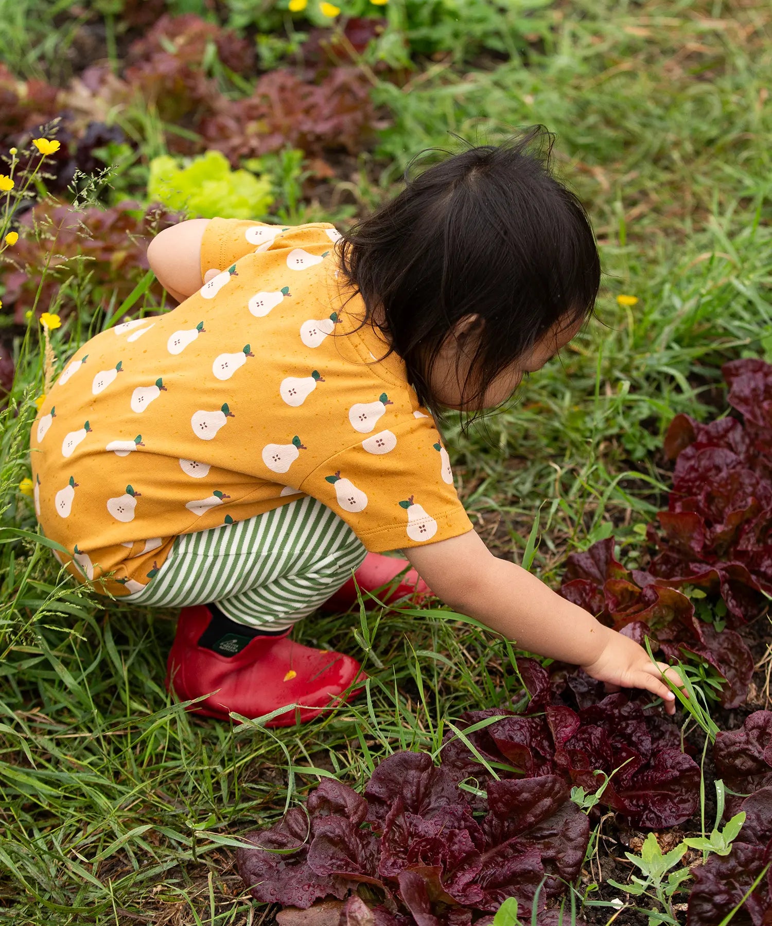 Back of the Little Green Radicals Summer pears organic cotton t-shirt and jogger playset being worn with red wellington boots. Repeat pattern gold pear t-shirt with green and cream striped trousers.
