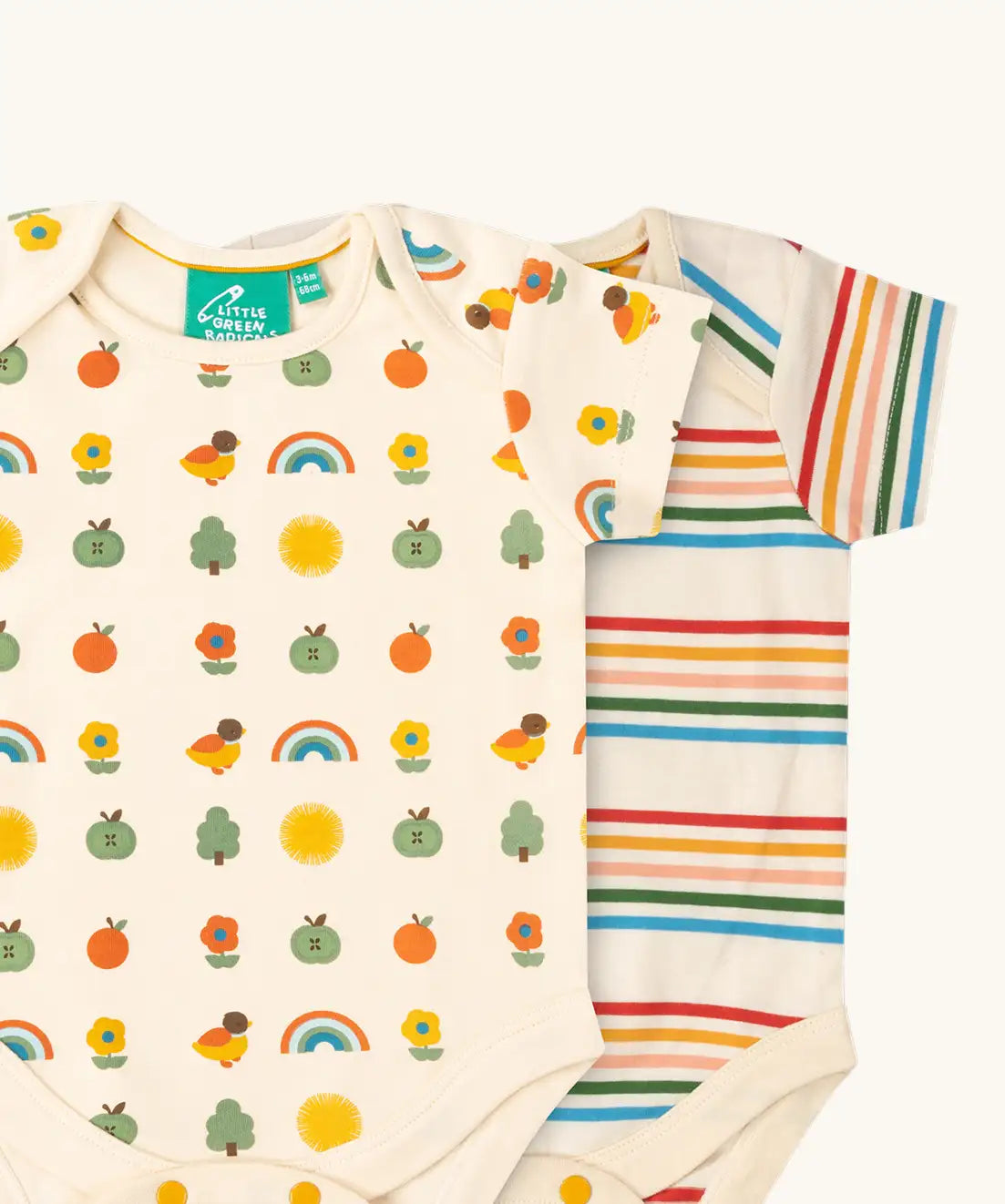 Little Green Radicals vintage style cream rainbows organic cotton short sleeved baby bodysuit 2 Pack. One vest with a repeat nature themed print and one with a cream rainbow striped design.