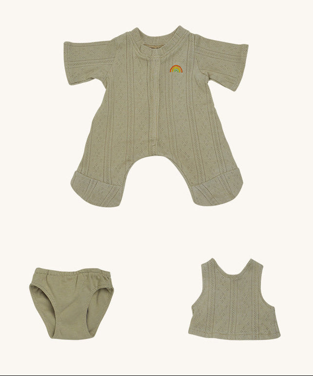 Olli Ella Dinkum Doll pointelle pyjama set in sage colour, available at Babipur. This set includes a onesie, a vest and underwear. This set can be used on a Olli Ella dinkum doll.