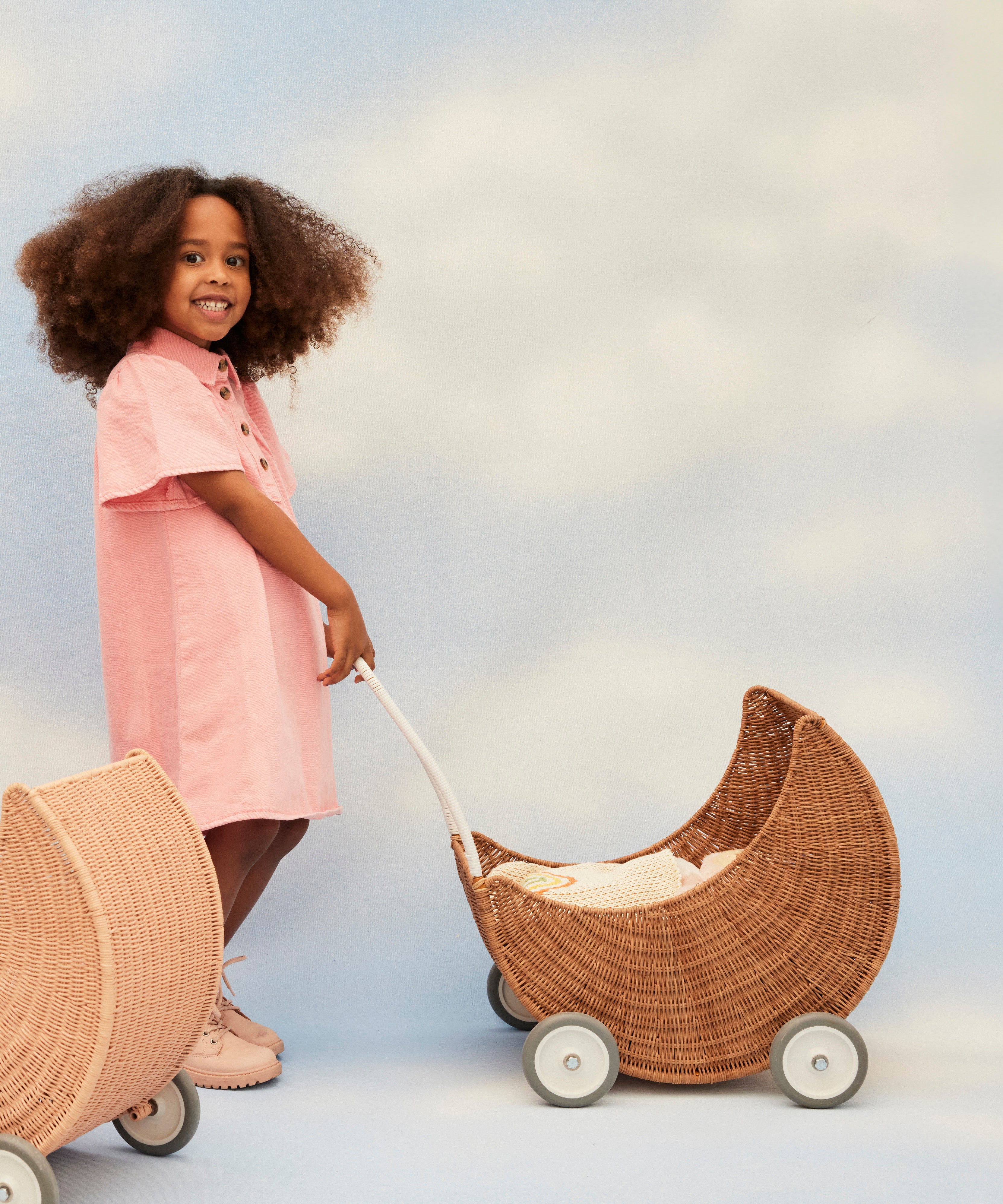 The Olli Ella Natural Moon Strolley is a natural rattan pram with a removable white handle suitable for toddlers from 18 months supervised. The unique curved moon-shaped design is spacious enough to hold dolls and other toys for trips around the house and garden. This timeless toy pram will be loved by children for imaginative play, visiting the shops and transporting their possessions. Sustainably made from handwoven natural rattan with sturdy recycled plastic wheels, this sturdy toy pram is a great choice for eco-conscious parents.