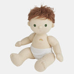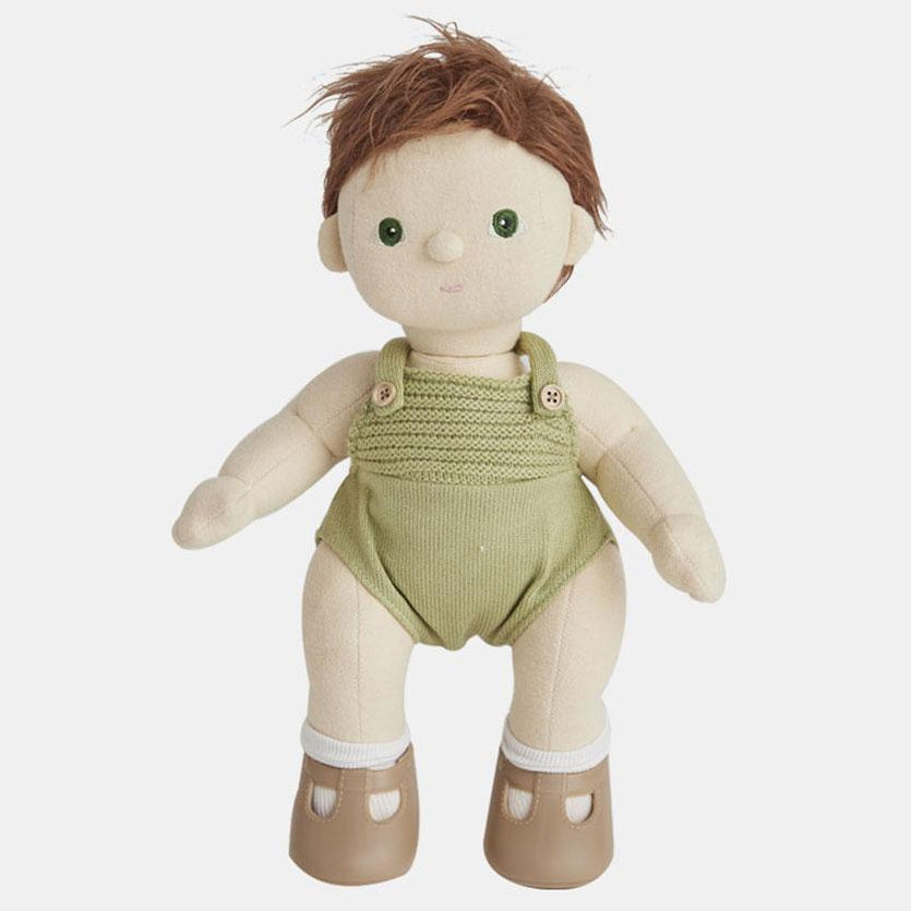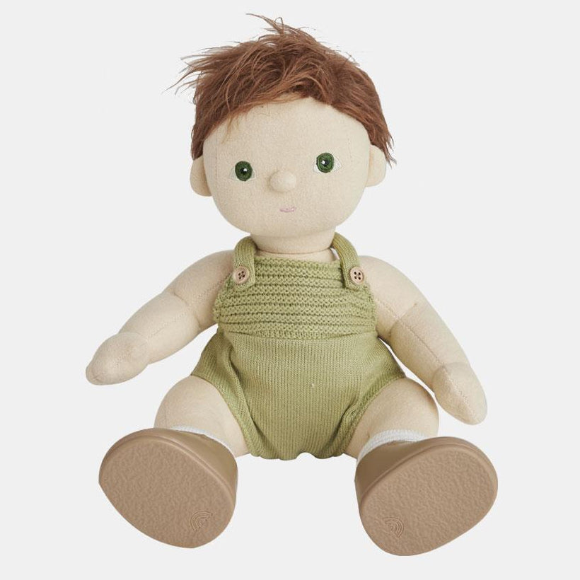 Pumpkin is an adorable Dinkum Doll from Olli Ella, with white skin, green eyes, auburn hair and button nose. Pumpkin is wearing a knitted light green romper, nappy, white socks and tan shoes. A traditional Vintage style doll made from 100% soft brushed cotton, and soft hair made from polyester mohair that can be brushed, styled and even washed. These sweet Dinkum Dolls have moveable arms, legs and head, and are posable - they can sit and even stand when they are wearing their shoes.