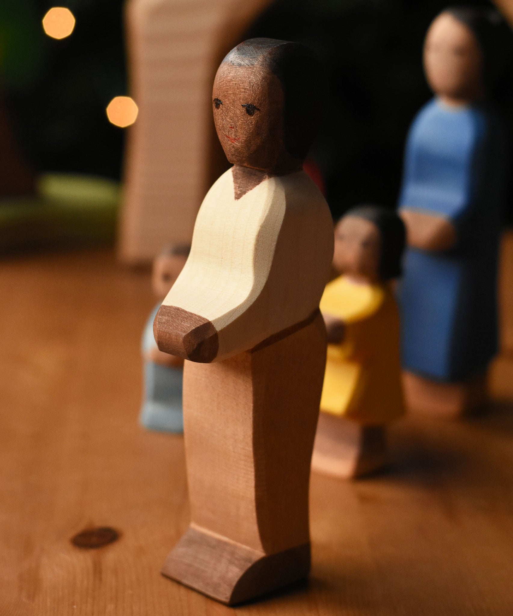 An Ostheimer father wooden toy figure with brown skin placed at the front of a small world play scene. These wooden figures are part of a wide range of expertly hand crafted wooden toys here at Babipur.