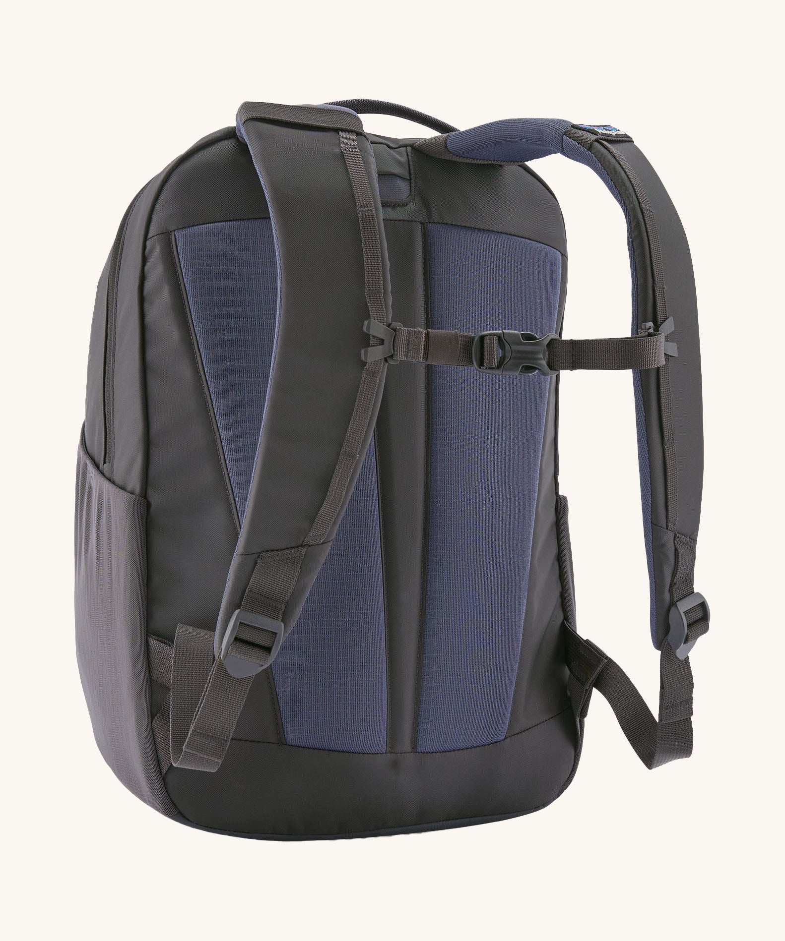 A reverse image of the Patagonia 24L smolder blue atom day pack in  showing the padded shoulder strap and pale black chest strap detail
