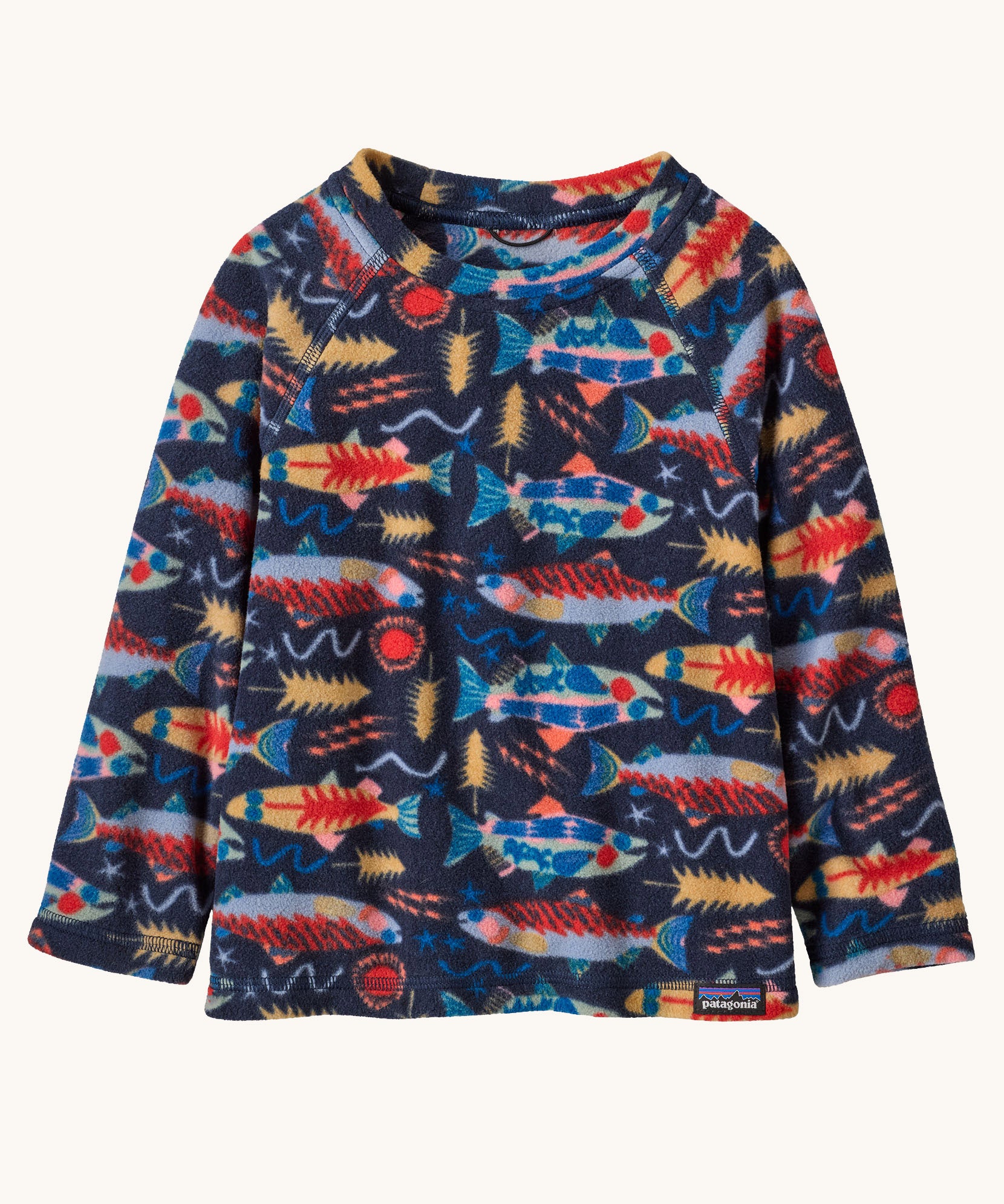 Patagonia kittle kids micro d crew jumper in salmon energy/new navy available at Babipur. A 100% recycled polyester soft fleece jumper in navy with a funky multicoloured fish pattern design