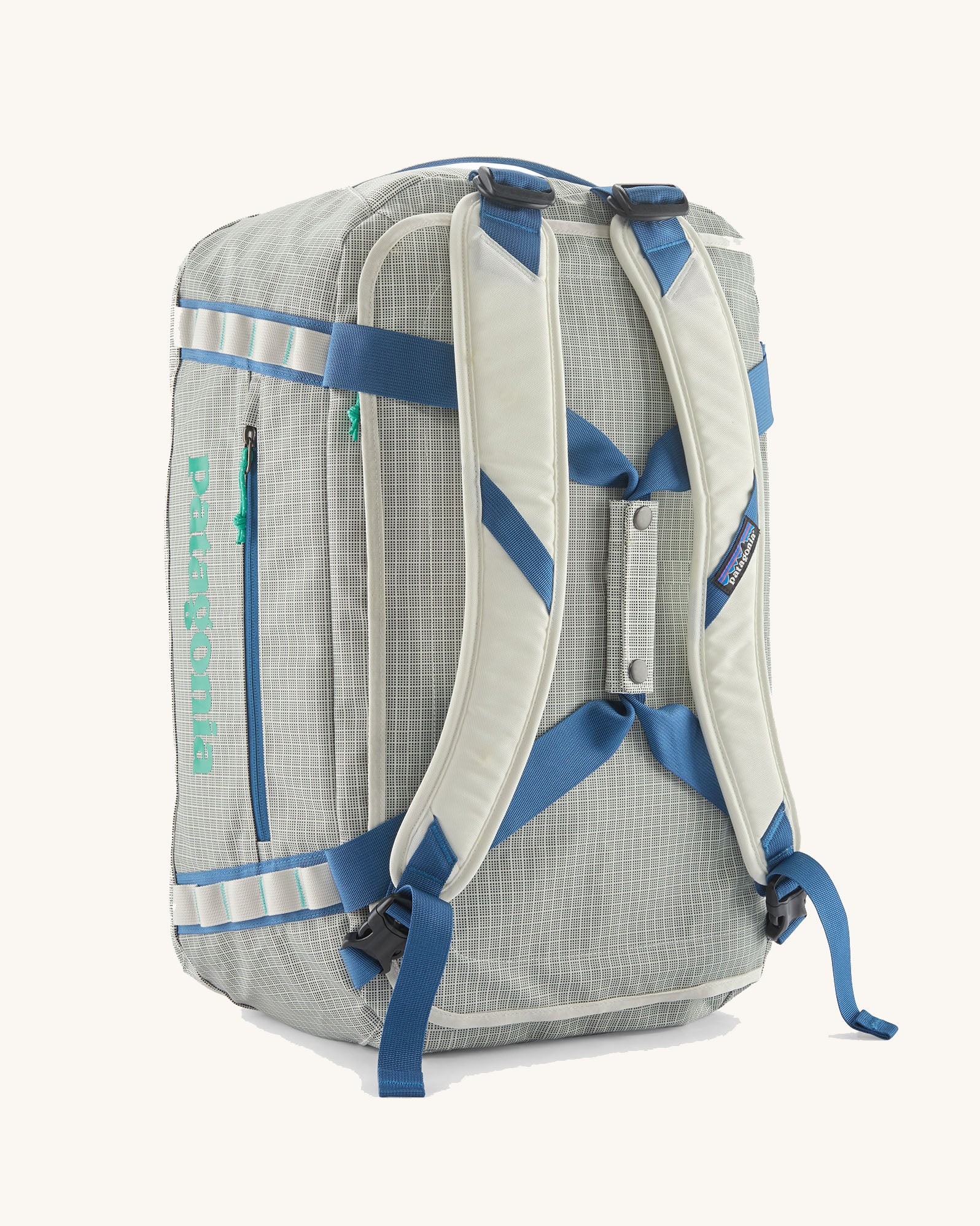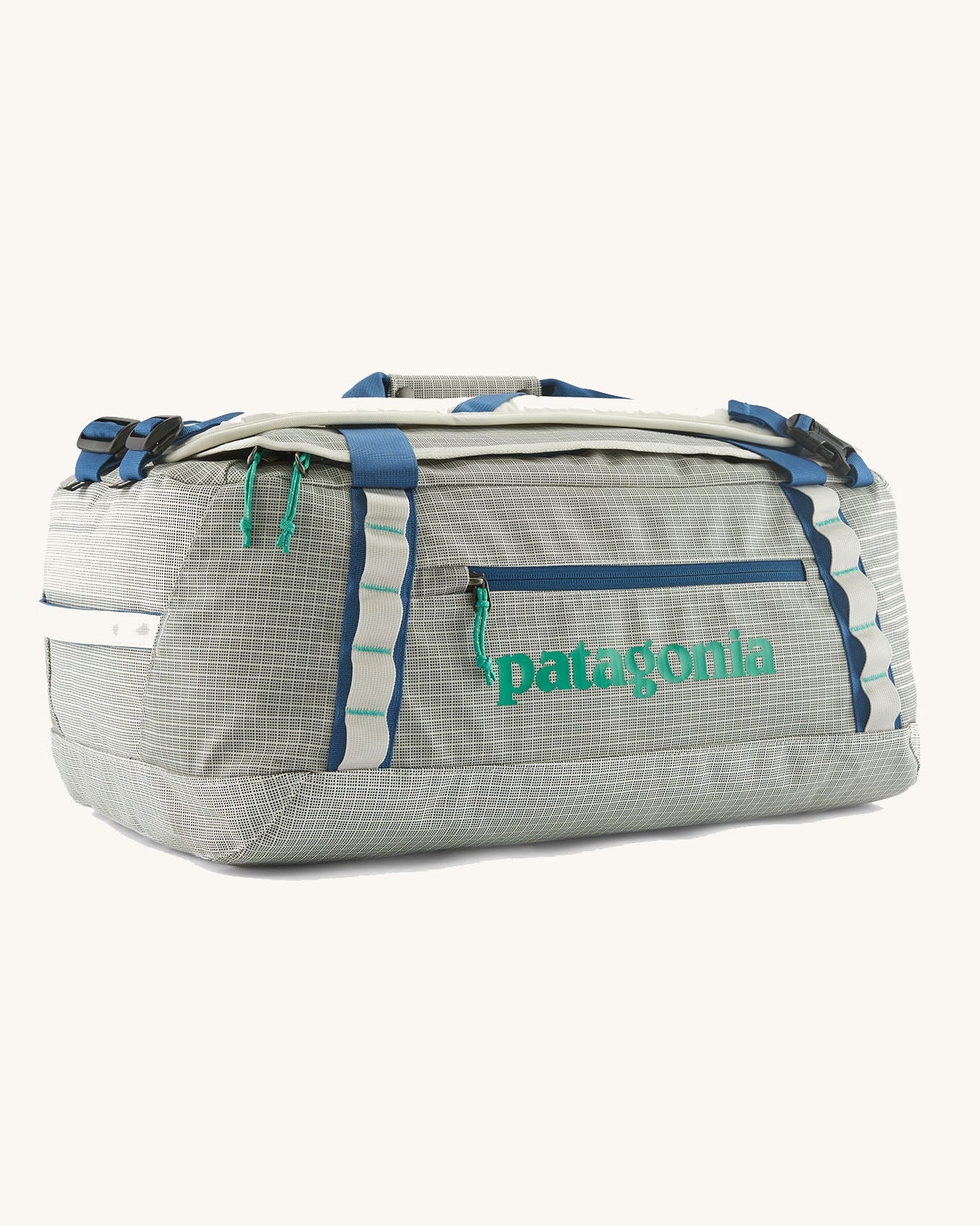 Patagonia black hole 40l duffel bag in birch white with blue zip details and mint green printed logo.