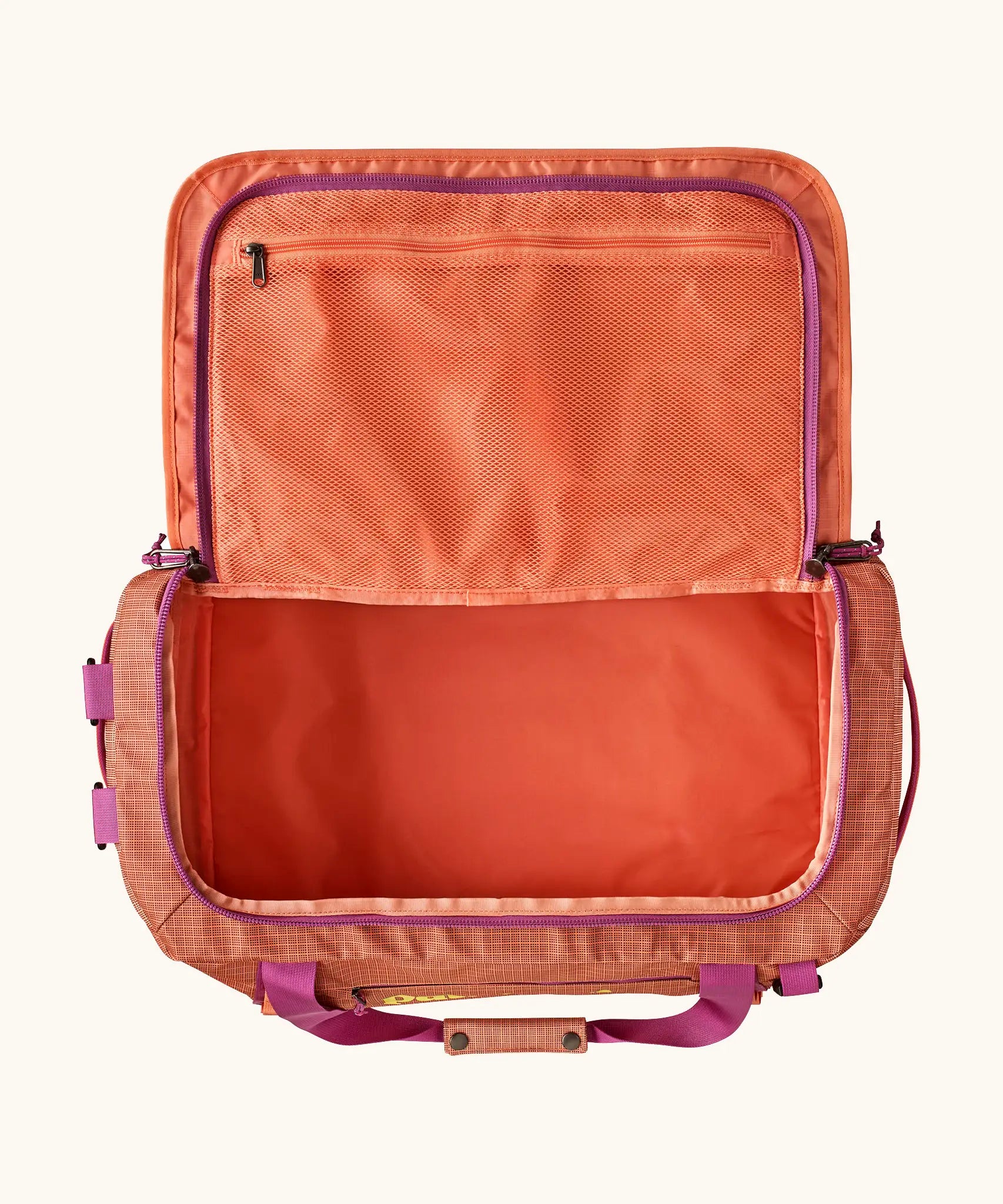 Open Patagonia black hole 40l duffel bag in light orange showing extra zipped mesh compartment on inside lid