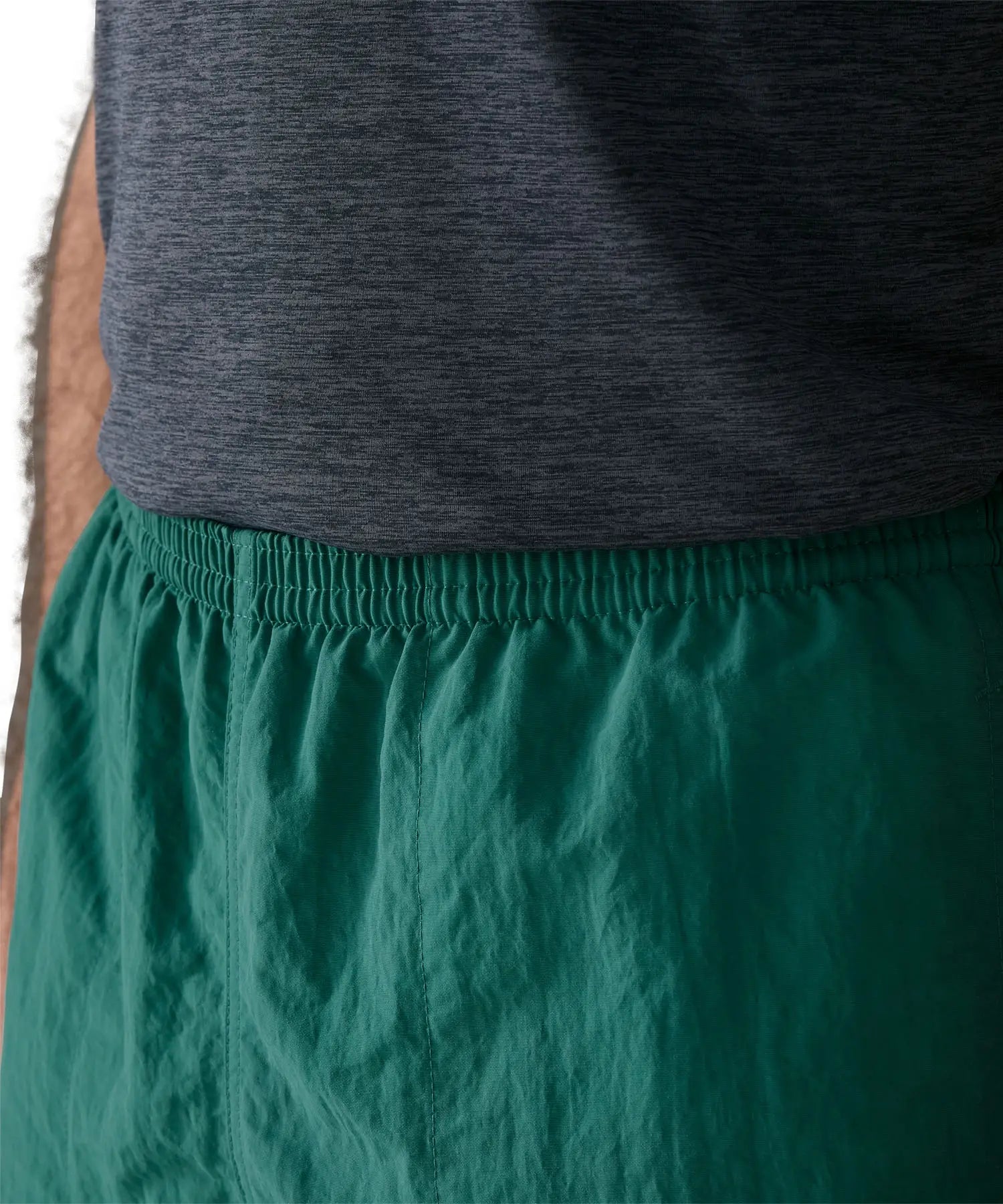 Close up of man wearing Patagonia's men's quick drying baggies shorts in teal green. Shows elasticated waist band