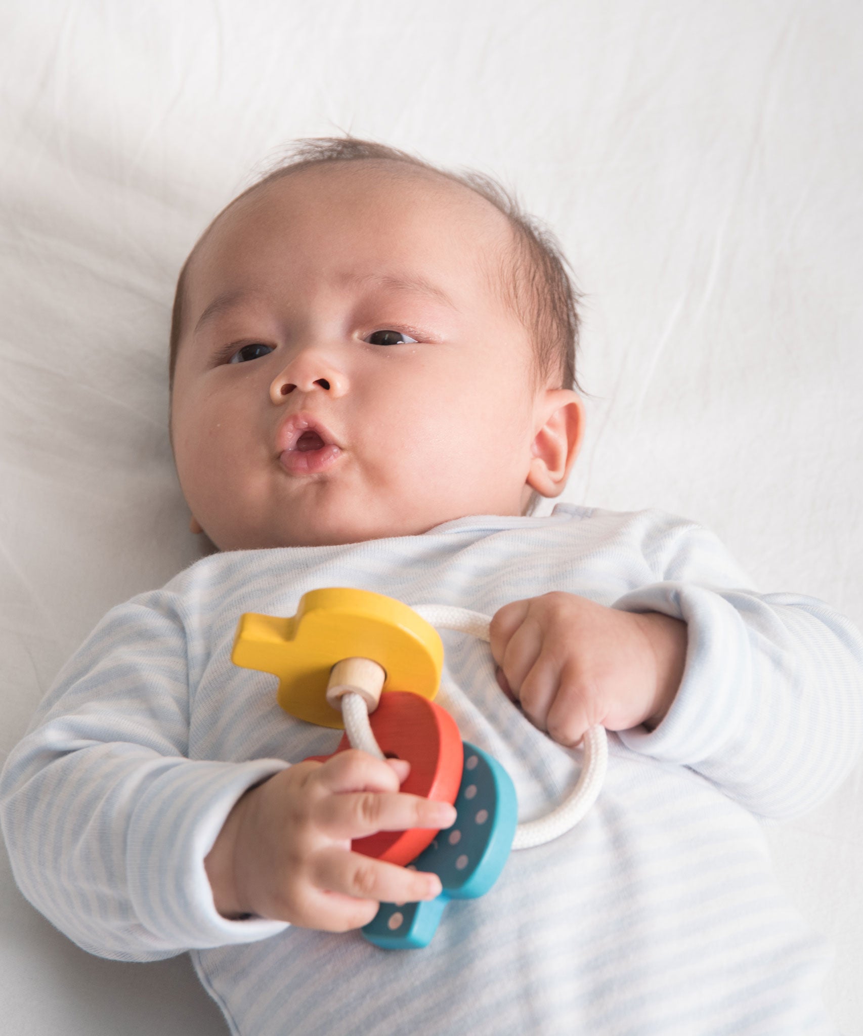 A baby being held by and adult, the baby is holding on to the PlanToys Baby Key Rattle.