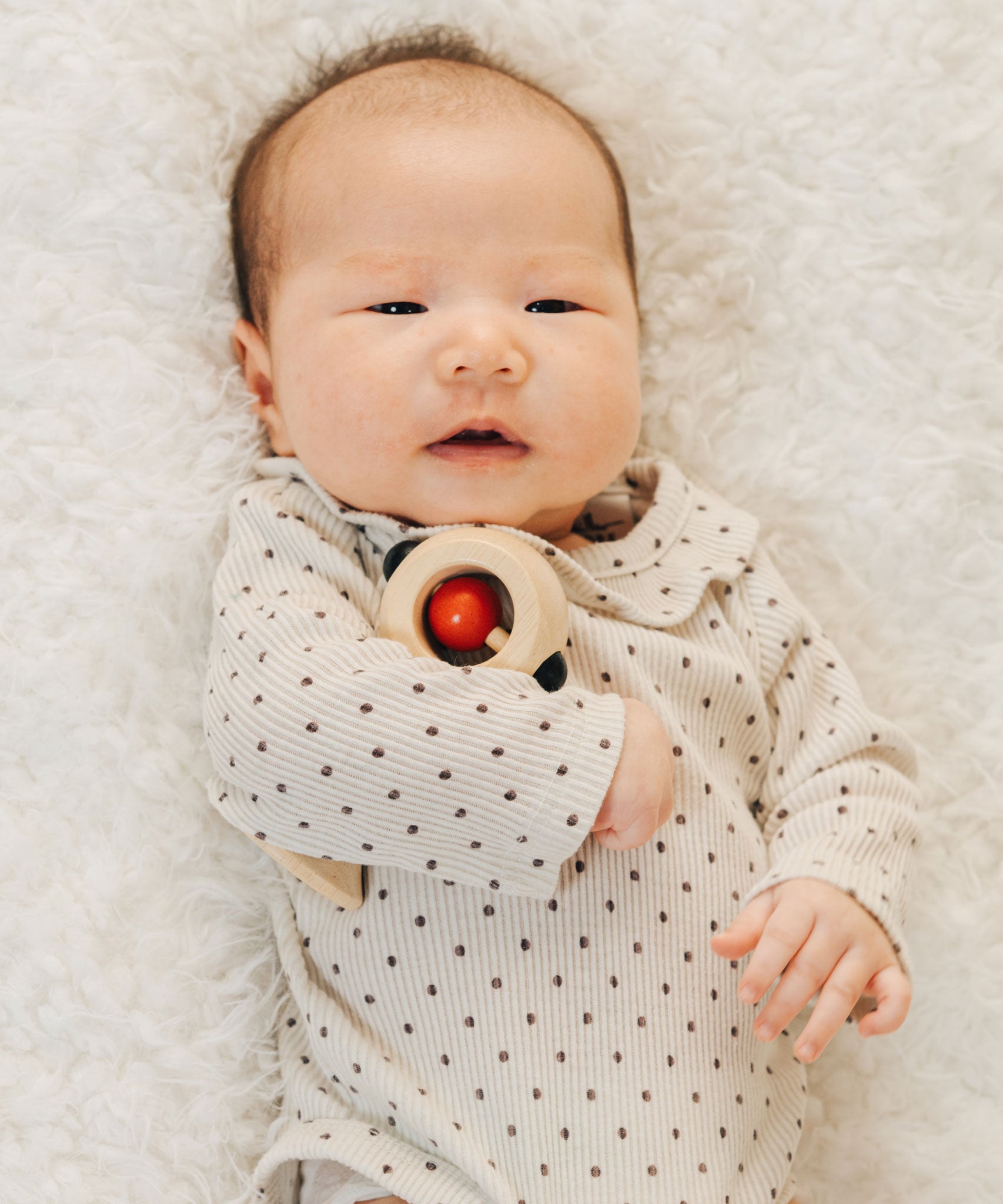 A baby with a PlanToys Shaking Rattle in a High Contrast colourway under their arm. The red and black details stand out against the natural rubberwood body. PlanToys range of toys are made from sustainably sourced rubberwood, we're proud stockists of PlanToys here at Babipur.
