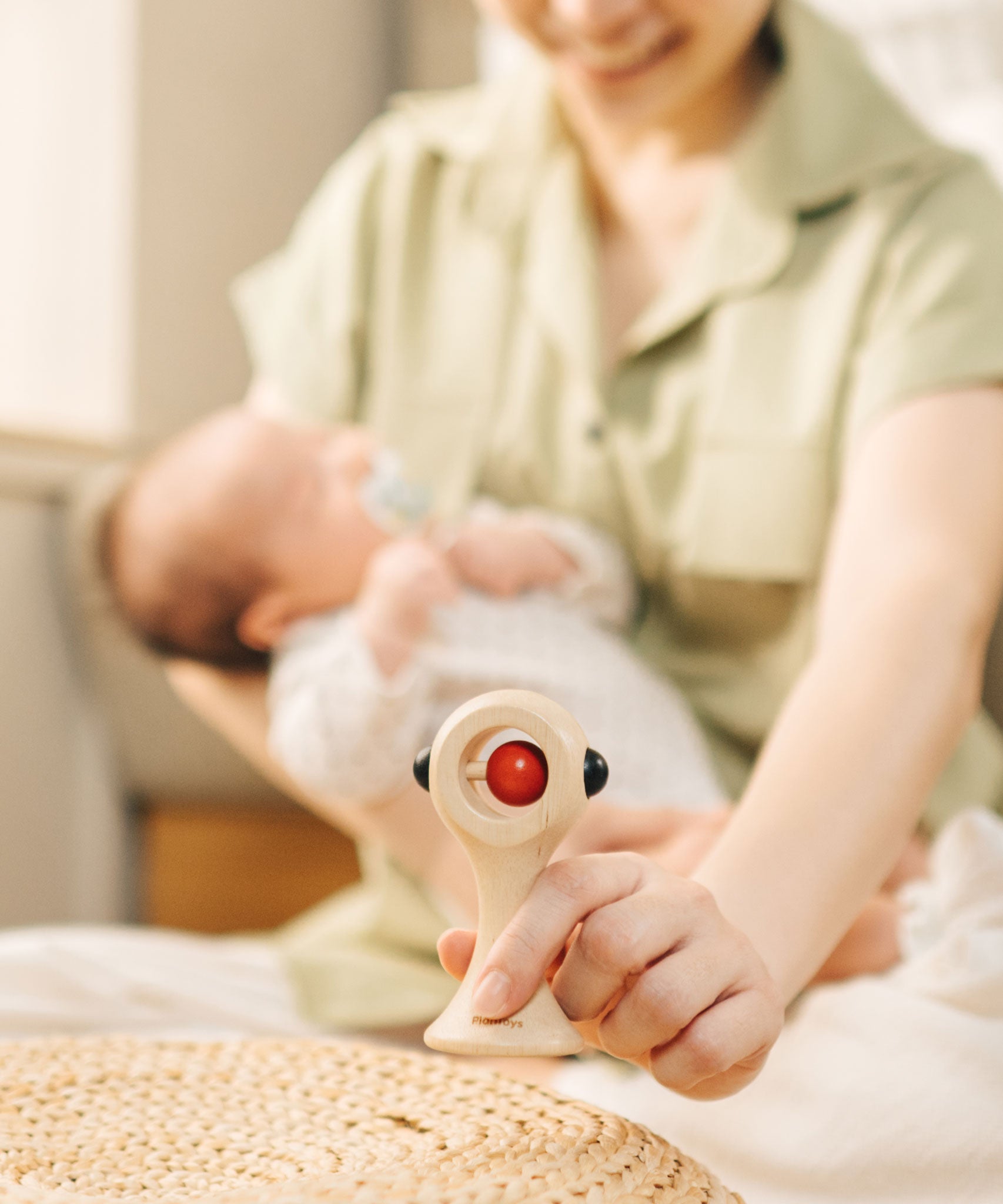 An adult holding up the PlanToys Shaking Rattle in a High Contrast colourway above a baby. The red and black details stand out against the natutral rubberwood body. PlanToys range of toys are made from sustainably sourced rubberwood, we're proud stockists of PlanToys here at Babipur.