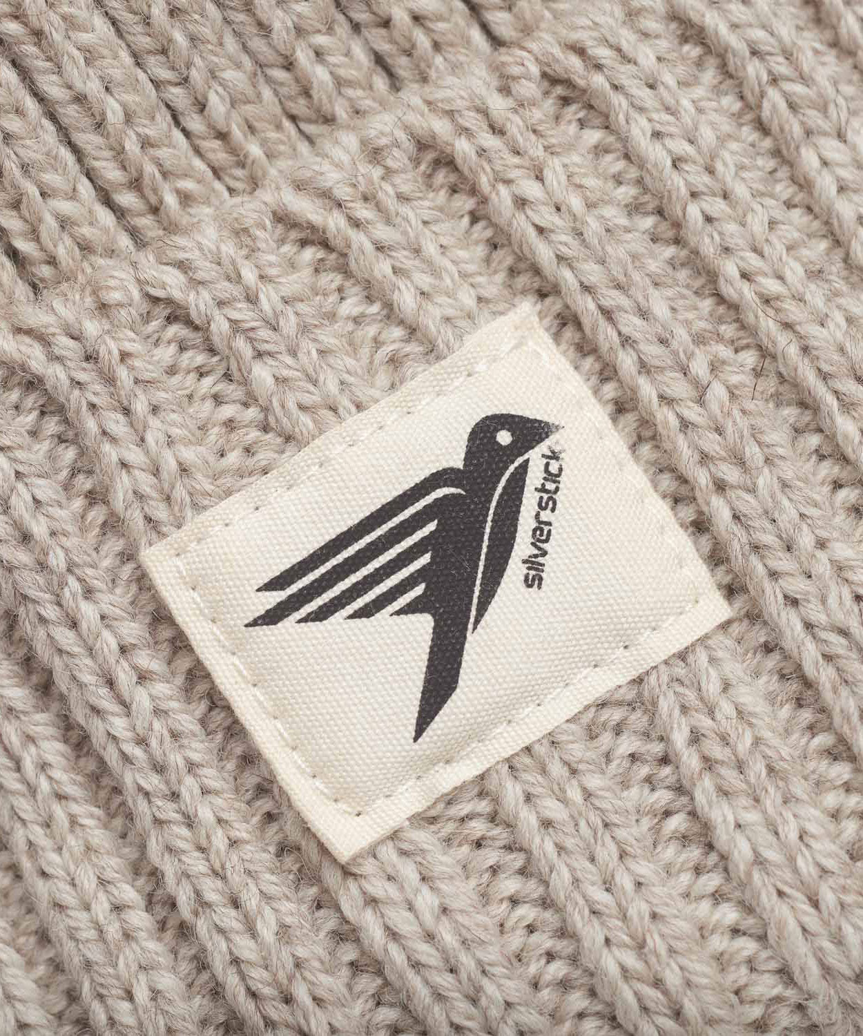 A close up of the label on the Silverstick Moffat Merino Wool Beanie in the Oat colourway. Silverstick are proudly made in the UK and available at Babipur.