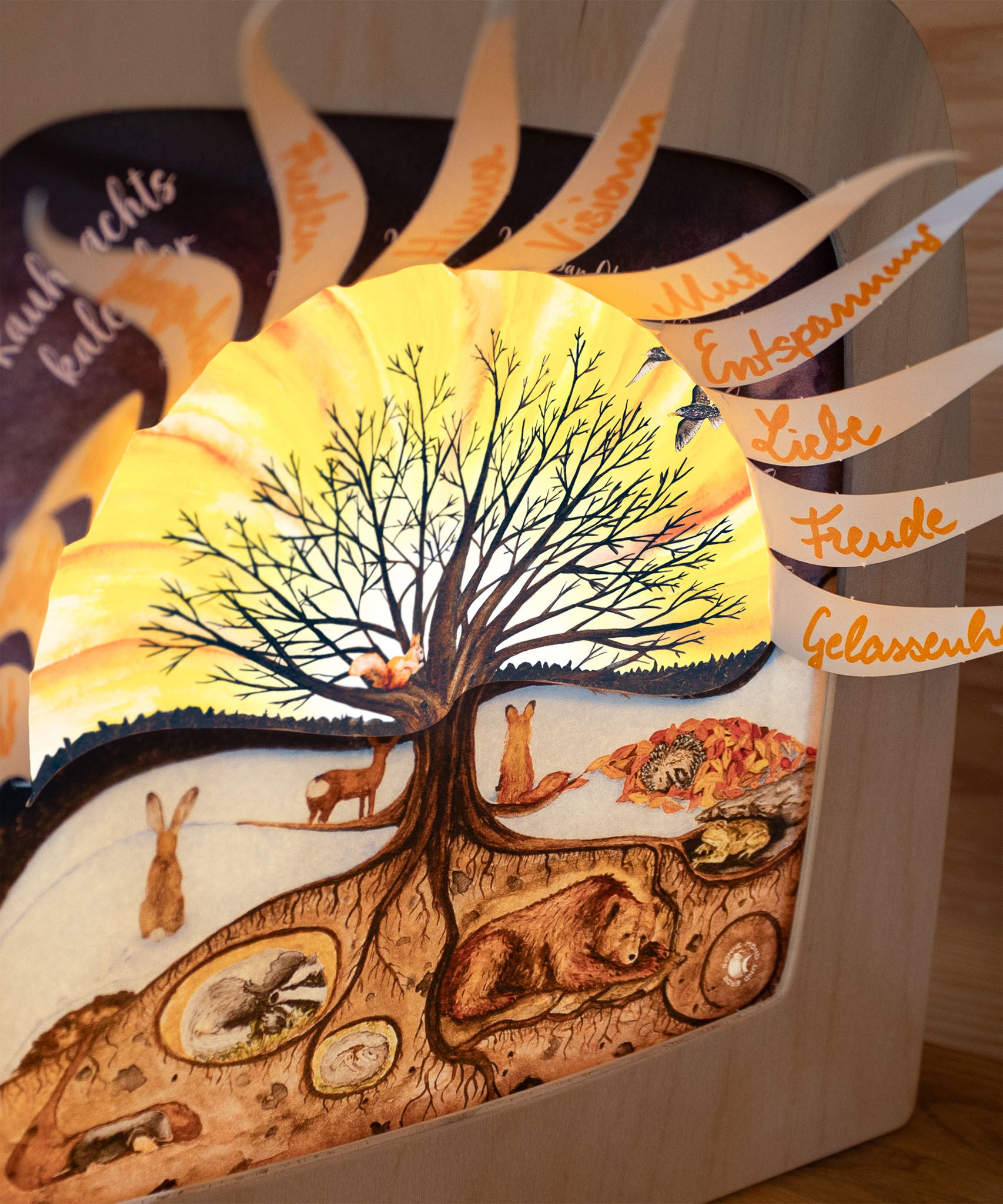 To use the 12 Holy Nights Calendar in your Toverlux Lamp or Window Frame, cut along the fold in the middle of the card and place the front panel inside your frame. Alternatively, unfold the calendar and position it before an LED tea light or windowsill, allowing each opened sunbeam to glow gently as you journey through the Twelve Nights.