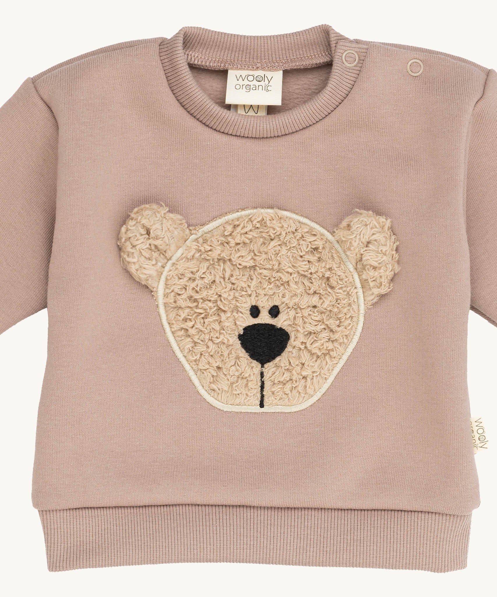 Wooly Organic embroidered sweater in pale blush pink /savannah available at Babipur. A soft GOTS organic cotton jersey sweater in light pink with a cute fluffy cream teddy bear on the front. Features popper fasteners on the shoulder for a easy fit